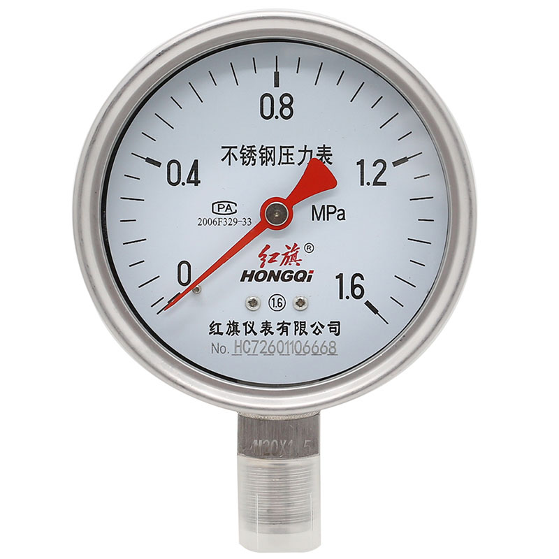 不銹鋼壓力表由導壓系統(tǒng)(包括接頭、彈簧管、限流螺釘?shù)?、齒輪傳動機構(gòu)、示數(shù)裝置(指針與度盤)和外殼(包括表殼、表蓋、表玻璃等)所組成。