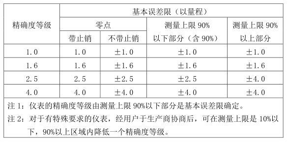 根據(jù)國家標(biāo)準(zhǔn)《一般壓力表》(GB/T 1226-2010),普通壓力表的精度分為1.0級(jí)、1.6級(jí)、2.5級(jí)和4.0級(jí);根據(jù)國家標(biāo)準(zhǔn)《精密壓力表》(GB/T 1227-2010,精密壓力表的精度分為0.1級(jí)、0.16級(jí)、0.25級(jí)和0.4級(jí)。